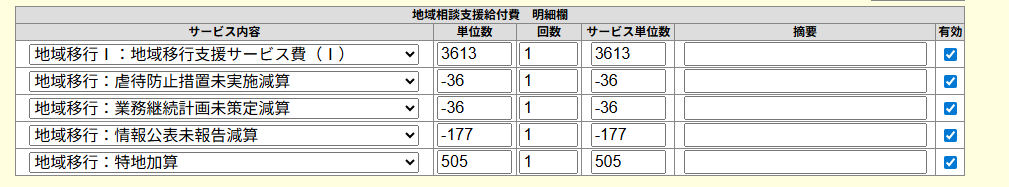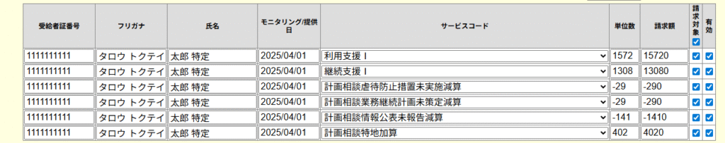 ※対象の4つのサービスコードの「単位数」「サービス単位数」は手入力で変更できません。