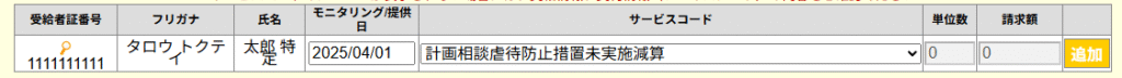 ※サービスコードの追加の時点では「単位数」「請求額」は0になります。