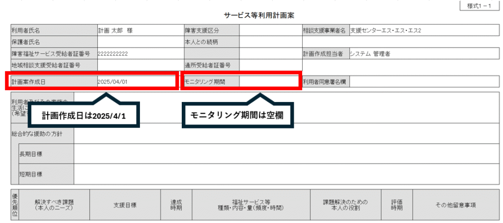 計画様式で空欄となる場合は、該当する開始日と「様式作成日」が適切であるか、確認を行ってください。