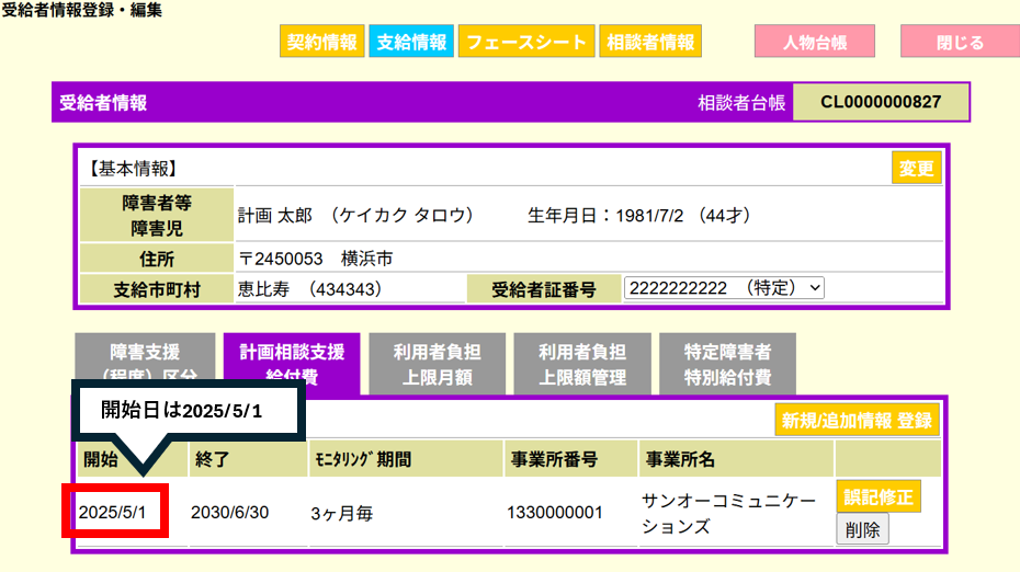 支給情報 計画相談支援給付費の開始日が「2025/5/1」
